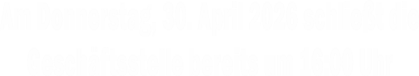 Mo - Di 9:00 - 12:00 Uhr + 14:00 - 16:00 Uhr